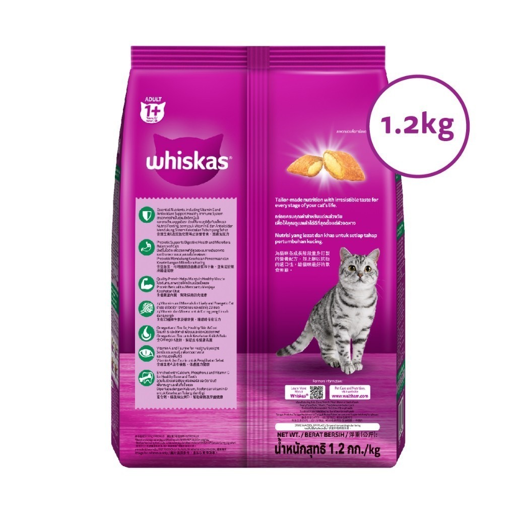 Thức ăn cho mèo WHISKAS (1,2 kg) được bào chế dành riêng cho mèo trưởng thành từ 1+ tuổi. Được làm từ các nguyên liệu chất lượng cao, thức ăn cho mèo dạng hạt này mang đến cho người bạn lông xù của bạn một bữa ăn thỏa mãn và bổ dưỡng mỗi ngày.